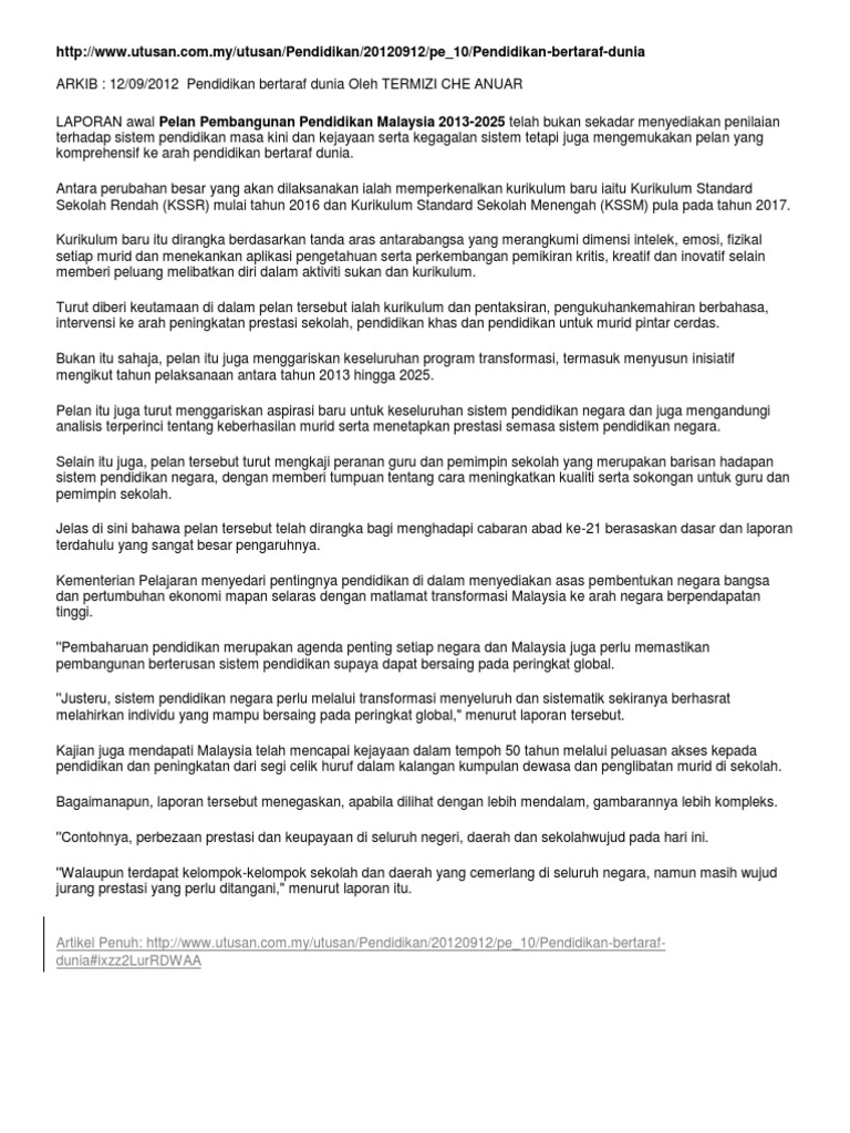 Kejayaan malaysia dalam bidang pendidikan. Menurut akhbar utusan malaysia bertajuk cabaran perubahan dasar 3 pendidikan oleh tan sri alimuddin mohd dom 4 menyatakan bahawa perkembangan bidang pendidikan merupakan antara faktor perkembangan pelbagai bidang terutamanya bidang politik ekonomi dan sosial pada abad ke 21 di seluruh dunia sama ada di negara maju mahupun negara yang sedang membangun seperti malaysia. Misi kementerian pelajaran malaysia ialah membangunkan sistem pendidikan yang berkualiti dan bertaraf dunia di samping memperkembangkan potensi individu sepenuhnya dan memenuhi aspirasi negara. Kementerian pelajaran malaysia menetapkan matlamat iaitu melahirkan bangsa.