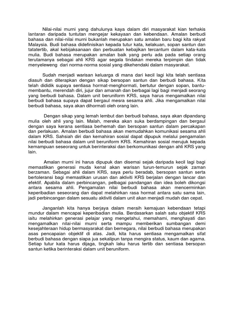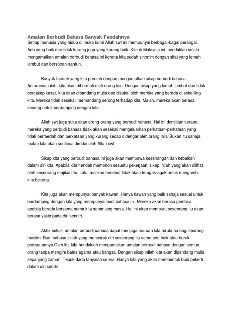 Kempen budi bahasa dan nilai nilai murni perlulah diimplementasikan dari semasa ke semasa untuk meningkatkan kesedaran rakyat. M masyarakat yang berbudi bahasa akan saling menghormati tidak kira apa apa jua warna kulit ataupun status individu tersebut. Kepentingan berbudi bahasa dalam masyarakat malaysia terdapat banyak kepentingan berbudi bahasa dalam masyarakat iaitu dapat mewujudkan perpaduan antara masyarakat berbilang kaum di negara kita. Bahasa menunjukkan bangsa budi bahasa atau perangai serta tutur kata menunjukkan sifat dan tabiat seseorang baik buruk kelakuan menunjukkan tinggi rendah asal atau keturunan hancur badan dikandung tanah budi baik terkenang jua budi bahasa yang baik tidak akan dilupakan orang.