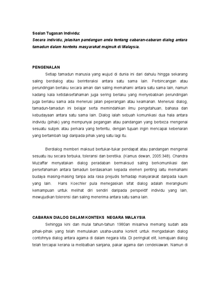 Kepelbagaian tamadun dan telah menjalani hidup secara harmoni dengan bertunjangkan nilai toleransi dan persefahaman. Merujuk situasi di malaysia melalui dialog boleh memanfaatkan keadaan di mana nilai nilai tamadun yang diwarisi rakyat malaysia banyak persamaan dari sudut adab kemanusiaan dan alam. Azizan baharuddin zaid ahmad ahmad tarmizi talib jayum anak jawan sarjit singh darshan singh nurdeng deuraseh ahmad nasir mohd yusoff adlina abd. Manakala dialog bermaksud perbincangan antara dua pihak atau lebih tamadun pula bermaksud keadaan kemajuan atau pemikiran budaya sosial politik peradaban dan lain lain menurut leonard swidler dialog bererti perbincangan mengenaisesuatu perkara antara dua orang atau lebih yang berbeza pandangan dengan tujuan utamauntuk setiap pihak dapat mempelajari dari pihak lain agar mereka boleh.