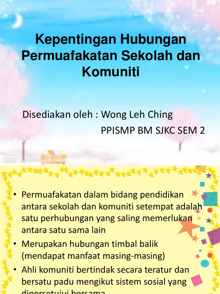 Wong leh ching ppismp bm sjkc sem 2 permuafakatan dalam bidang pendidikan antara sekolah dan komuniti setempat adalah satu perhubungan yang saling memerlukan antara satu sama lain merupakan hubungan timbal balik mendapat manfaat masing masing ahli komuniti bertindak secara teratur dan bersatu padu. Pelbagai faktor dalam persekitaran sekolah seperti gabungan guru dan kepentingan profesional telah didapati mempengaruhi amalan pengajaran. Maka perhubungan sekolah dengan komuniti boleh diibaratkan bagai isi dengan kuku mereka saling berinteraksi dan saling mempengaruhi antara satu sama lain.