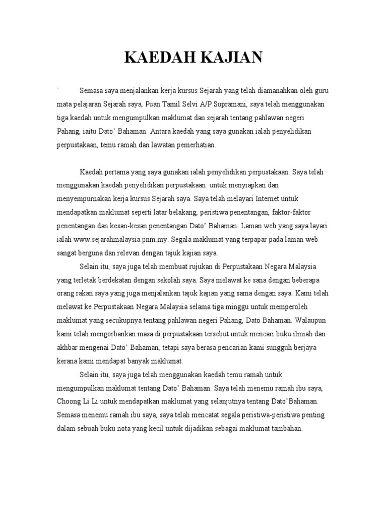 Kerja kursus sejarah dato maharaja lela. Perjuangan dato maharajalela di perak latar belakang dato maharaja lela ialah orang besar berlapan perak dan penghulu di pasir salak. Dato maharaja lela perjuang kebanggan perak pengenalan peristiwa perjuangan sebab sebab penentangan kesan pengenalan. Contoh kerja kursus sejarah pt3 2020 contoh rujukan terbaik tingkatan 3 terdapat beberapa contoh rujukan yang ingin dikongsikan bersama dengan adik adik di sini calon pt3 untuk artikel kali ini. Dapatan kajian latar belakang tokoh lahir pada 1957 berumur 60 tahun lahir di kampung pulau besar kampung gajah pendidikan rendah di sk pasir panjang ulu pendidikan menengah di smk dato maharaja lela bertukar tempat belajar di smk horley methodist tingkatan 6 di smk tun fatimah johor bahru menyambung ijazah sarjana muda di universiti malaya smk seri perak.