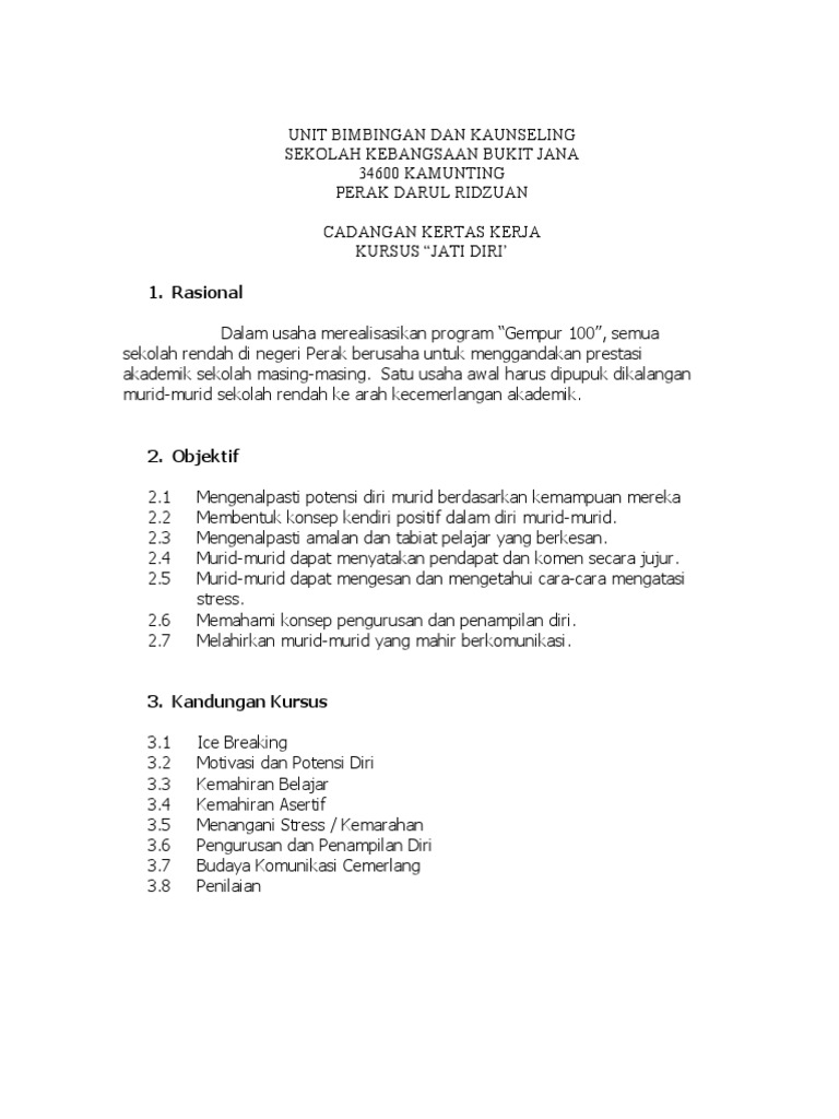 Kertas kerja kem jati diri sekolah rendah. Menyuap makanan dengan tangan sediri adalah modul wajib bagi meningkatkan ukhwah. 1 0 pengenalan ahli jawatankuasa badan disiplin dengan kerjasama jawatan kuasa bimbingan kaunseling sekolah kebangsaan telah bercadang untuk mengadakan satu program pembentukkan sahsiah diri. 8 30 pagi 5 30 petang tempat. Cadangan kertas kerja kursus jati diri 1.