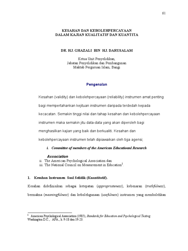Instrumen berskala likert lima mata yang mengandungi 68 item dibina. Halim tamuri salleh amat1 abstract this article discussed the construct validity and reliability of faith appreciation questionnaire. Kesahan dan kebolehpercayaan instrumen kajian kamaruzaman moidunny phd jabatan pembangunan pengurus pemimpin dan eksekutif pend. Metodologi pembinaan instrumen adalah berpandukan model penilaian konteks input proses produk kipp.