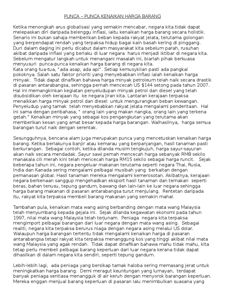 Kesan kenaikan harga minyak. Sehubungan dengan itu apabila harga minyak semakin tinggi maka harga makanan juga akan semakin melambung tinggi. Kenaikan ini menyebabkan perbelanjaan rakyat malaysia semakin bertambah. Lebih lebih lagi yang tinggal di kawasan bandar besar. Oleh itu kenaikan harga barang memberikan impak yang sangat besar kepada kuasa beli masyarakat.