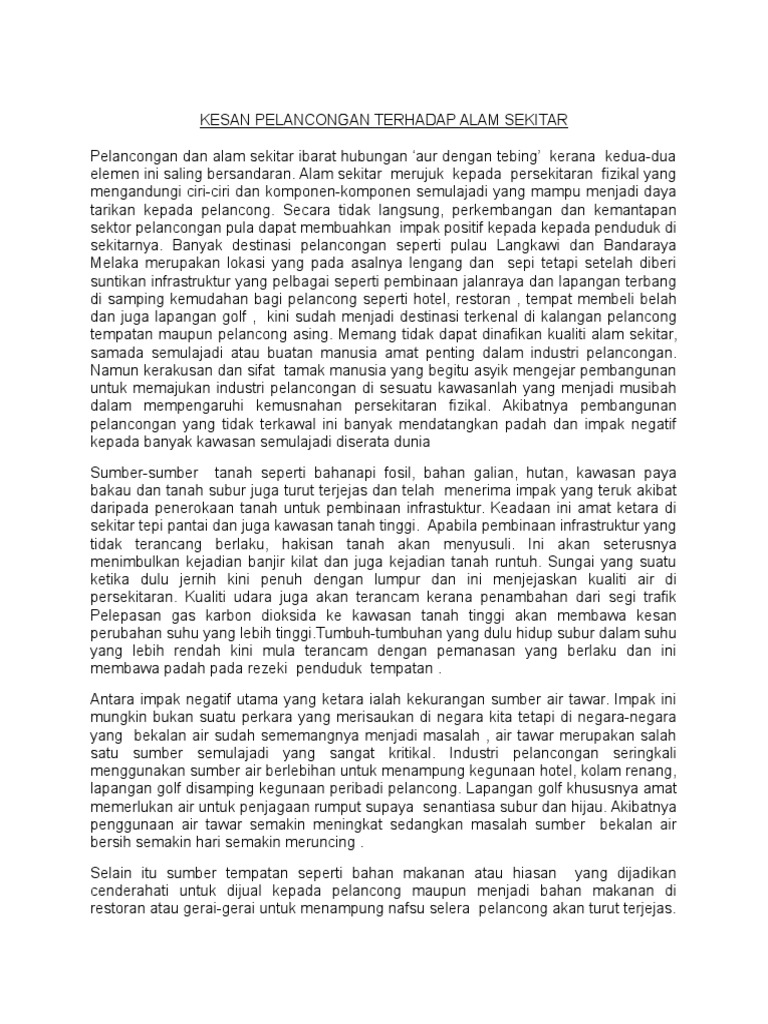13 masalah pencemaran budaya berlaku terhadap kalangan penducluk tempatan. Secara amnya produk ekopelancongan dilihat amat memberikan impak yang positif dari sudut pembangunan industri pelancongan negara dan juga menghasilkan faedah dalam bentuk ekonomi kepada penduduk tempatan dan kerajaan. Tan sri muhyiddin yassin menjelaskan anggaran kerugian keseluruhan dalam sektor pelancongan mulai januari hingga februari 2020 adalah sebanyak rm3 37 billion akibat penularan coronavirus covid 19. 2 b jelaskan kesan negatif aktiviti pelancongan terhadap alam sekitar fizikal dan manusia.