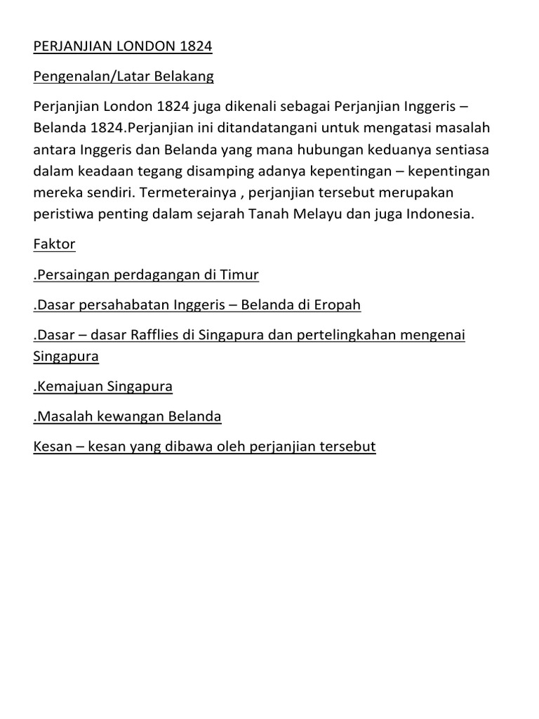 Kesan perjanjian london 1824 pada masa kini. Perjanjian inggeris 1824 juga dikenali sebagai perjanjian london 1824. Penyebabnya diadakannya traktat london. Perjanjian inggeris belanda 1824 juga dikenali sebagai perjanjian london 1824. Perjanjian ini ditandatangani untuk mengatasi masalah antara inggeris dan belanda yang mana hubungan keduanya sentiasa dalam keadaan tegang di samping adanya kepentingan kepentingan mereka sendiri.