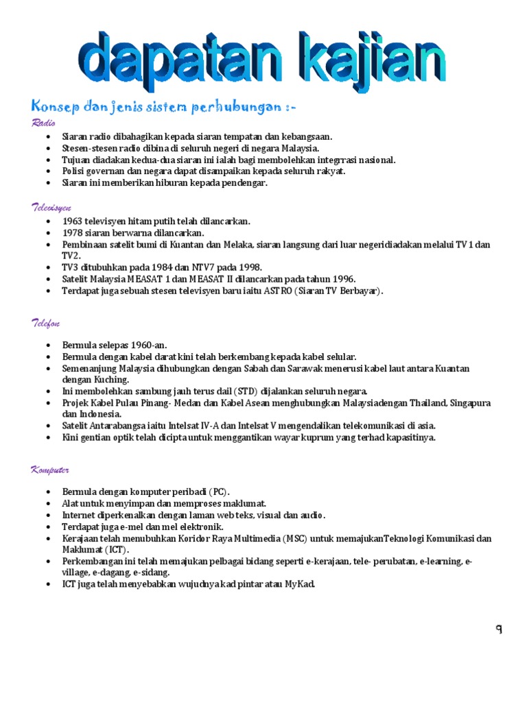 Banyak jenis maklumat boleh dihantar melalui sistem telekomunikasi termasuk suara dan muzik gambar dan gambar boleh bergerak fail komputer dan aplikasi serta data telegraf. Telekomunikasi bab 6di malaysiageografi tingkatan 26 1alat telekomunikasi di malaysia telefon pintar alat telekomunikasi telegrafmesin teleks telefon bimbit mesin faks telefon6 2kemajuan alat telekomunikasi di malaysia satelit telefon pintar syarikat telekomunikasi kabel fiber optik komputer koridor raya multimedia msc rangkaian jalur lebar berkelajuan tinggisatelit pembinaan stesen satelit. Ini termasuklah komunikasi menggunakan radio televisyen telefon dan komputer. Penerokaan dalam bidang telekomunikasi di malaysia bermula pada awal 1970 an dengan pembinaan stesen satelit bumi di kuantan pahang.
