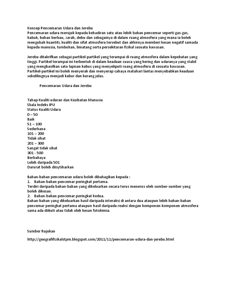 Semoga perkongsian bahan bahan rujukan panduan bahan pembelajaran dan pengajaran contoh contoh karangan sumber rujukan pt3 pentaksiran tingkatan 3 tingkatan 1 tingkatan 2 tingkatan 3 dalam post di blog bumi gemilang berguna dan dapat membantu para pelajar dan pengguna. Konsep pencemaran udara dan jerebu pencemaran udara merujuk kepada kehadiran satu atau lebih bahan pencemar seperti gas gas habuk bahan berbau zarah debu dan sebagainya di dalam ruang atmosfera yang mana ia boleh mengubah kuantiti kualiti dan sifat atmosfera tersebut dan akhirnya memberi kesan negatif samada kepada manusia tumbuhan binatang serta persekitaran fizikal sesuatu kawasan. Kabut asap ialah satu fenomena tradisi atmosfera di mana debu habuk asap dan lain lain zarah mencemar kejelasan langit. Kajian lapangan geografi pentaksiran tingkatan 3.
