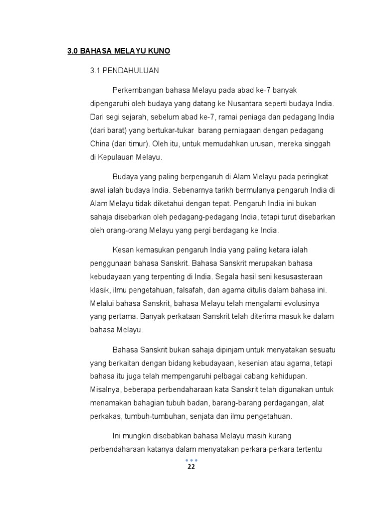 Awalan ni yang digunakan sebagai kata kerja pasif dalam bmk contohnya niwunuh dibunuh nikenai dikenai. Ismail hussein bahasa melayu kuno ialah bahasa melayu yang paling awal pernah ditemukan dalam bentuk tulisan. Bahasa melayu tergolong dalam keluarga bahasa nusantara di bawah golongan bahasa sumatera. Contoh contoh perkataan yang diambil daripada bahasa sanskrit adalah seperti syukasyitta athava karana tatakala dan sebagainya.
