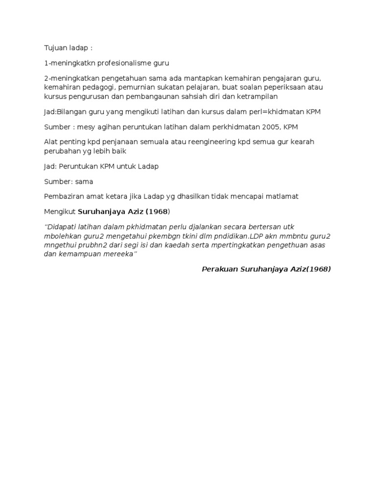 Untuk melihat persepsi guru terhadap kualiti latihan dan pembangunan profesionala perguruan di sekolah sekolah di malaysia. Objektif utama kajian ini dijalankan adalah. Guru atau setiausaha latihan dalam perkhidmatan ladap pastinya mempunyai tanggungjawab yang berat kerana harus memastikan guru guru lain menepati syarat ladap iaitu dengan mematuhi 42 jam latihan setahun dan sebagainya harap nota yang disediakan oleh miss i mampu membantu guru guru. Perbandingan prestasi kerja berdasarkan jantina.