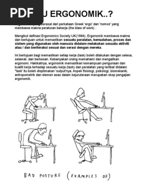 Penggunaan prinsip prinsip ergonomik di tempat kerja boleh menghasilkan. Ergonomik yang berasal dari perkataan greek ergo dan nomos yang membawa makna peraturan bekerja thelawofwork. Semangat yang baik dan motivasi kerja akan mengurangi angka kejadiannya di tempat kerja manuaba 2000. Ergonomik di tempat kerja terdapat 6 faktor risiko ergonomik posisi yang salah awkward postures berulangan repititive tekanan setempat contact stress posisi statik daya berlebihan persekitaran pencahayaan suhu kebisingan.