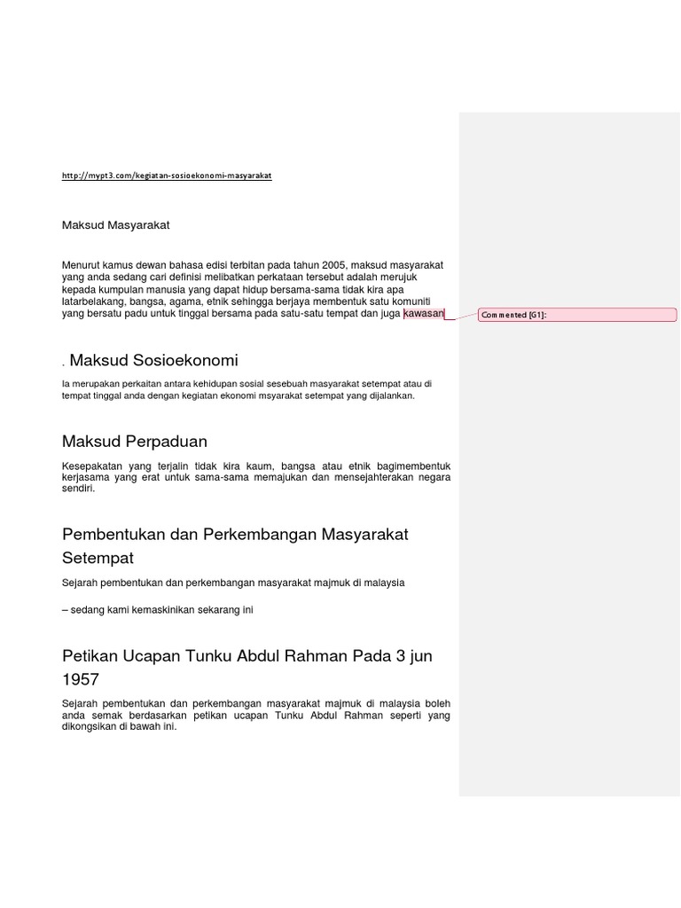 Walaupun sekelompok manusia merupakan masyarakat pengembara akan tetapi pada saat saat tertentu anggota anggotanya pasti berkumpul pada suatu tempat tertentu misalnyan bila mengadakan upacara. Mengacu pada pengertian masyarakat di atas suatu kelompok masyarakat mendiami di suatu wilayah tertentu secara bersama sama dan memiliki suatu sistem yang mengatur hubungan antar individu. Ia merujuk kepada semua perhubungan sosial yang mengaitkan manusia. Kita harus bersyukur kerana sejak memperoleh kemerdekaan pada 1957 negara pada umumnya kekal aman.