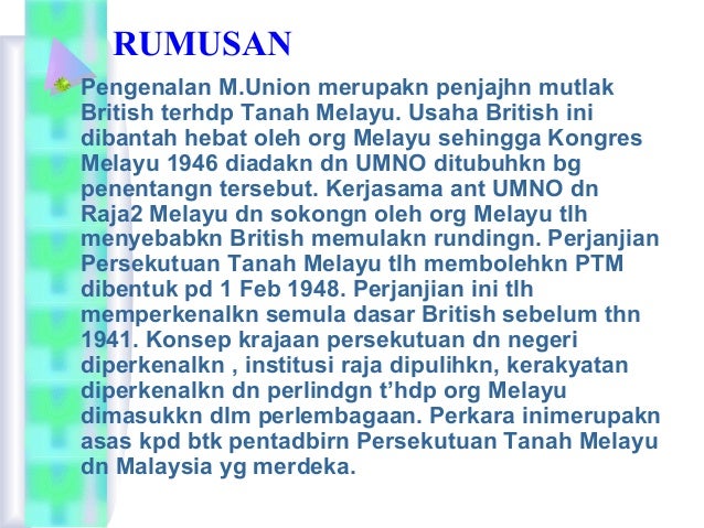 Pengenalan malayan union akan menghapuskan sejarah yang telah terbina sejak sekian lama. Di samping itu memberikan sebab sebab penerimaan pentadbiran baru iaitu persekutuan tanah melayu. Ciri ciri malayan union pembentukan kesatuan yang dikuasai oleh kerajaan pusat yang kuat pentadbiran tanah melayu berada. Kbsm tingkatan 5 sejarah subjek spm tingkatan 5 sejarah mengikut sukatan matapelajaran malaysia.