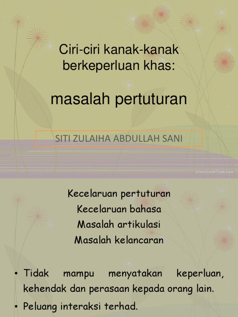 Masalah pertuturan kanak kanak berkeperluan khas. Masalah kanak kanak berkeperluan khas ini mungkindisebabkan oleh faktor faktor seperti perkembangan prenatalyang kurang sempurna kerana penyakit kekurangan zatmakanan ataupun dadah kerumitan semasa proses kelahiran boleh memberi kesankepada perkembangan kanak kanak. Garis panduan pengurusan pembukaan semula sekolah. Murid berkeperluan khas ertinya murid yang diperakukan oleh pengamal perubatan ahli optik ahli audiologi atau ahli psikologi mengikut mana mana yang berkenaan sama ada dalam perkhidmatan kerajaan atau tidak sebagai murid yang mempunyai ketidakupayaan penglihatan ketidakupayaan pendengaran ketidakupayaan pertuturan ketidakupayaan fizikal masalah pembelajaran atau mana mana kombinasi. 2 1 kanak kanak berkeperluan khas.