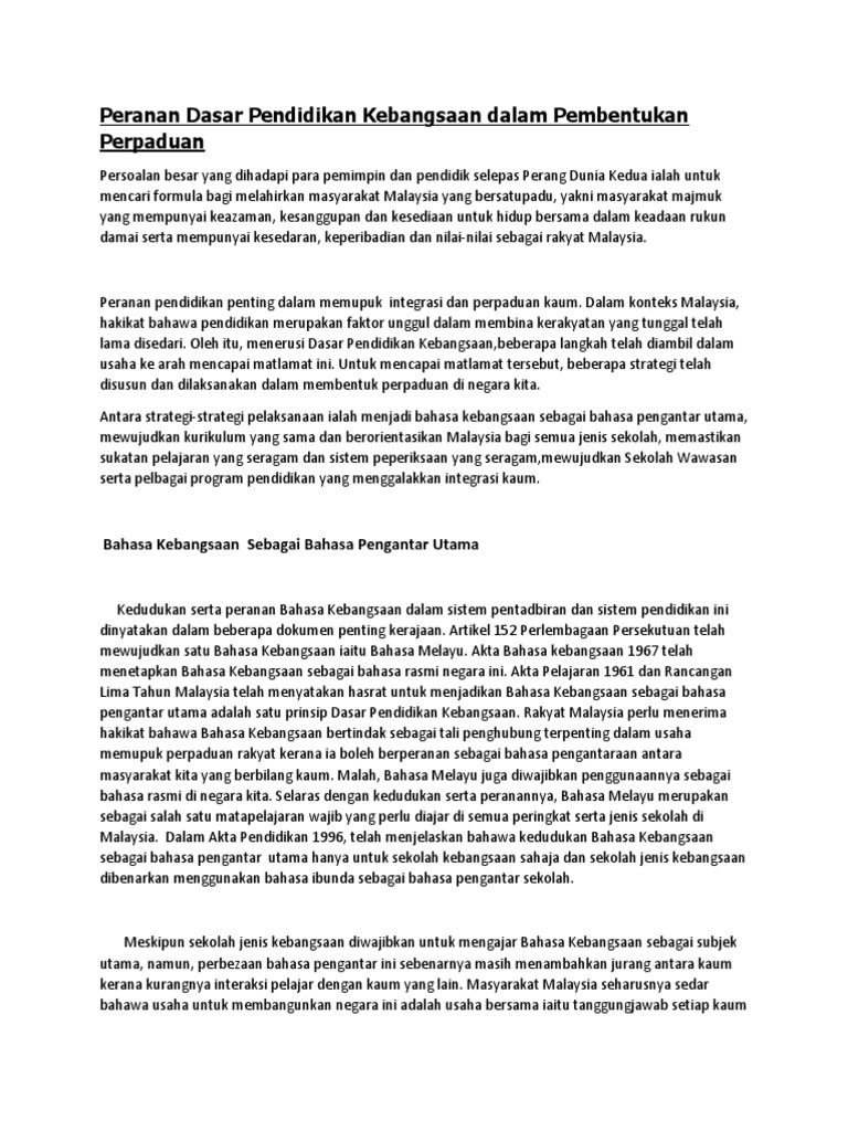 Perpaduan di kalangan masyarakat malaysia yang berbilang bangsa dapat diperkukuhkan lagi. Oleh itu menerusi dasar pendidikan kebangsaan beberapa langkah telah diambil dalam usaha ke arah mencapai matlamat ini. Dalam konteks malaysia hakikat bahawa pendidikan merupakan faktor unggul dalam membina kerakyatan yang tunggal telah lama disedari. Dalam konteks malaysia hakikat bahawa pendidikan merupakan faktor unggul dalam membina kerakyatan yang tunggal telah lama disedari.