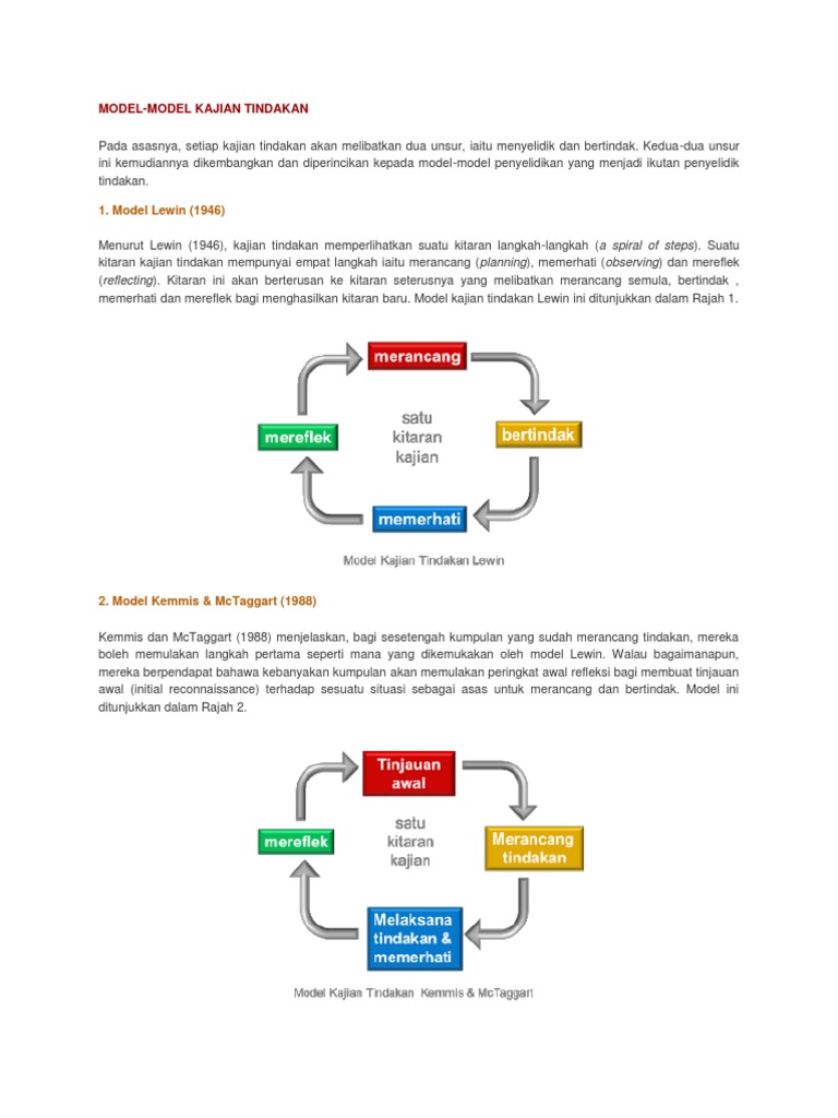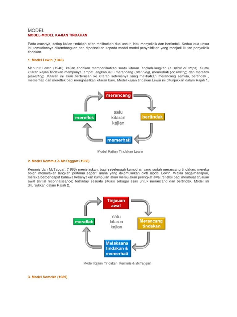 Model kemmis mctaggart 1988 kemmis dan mctaggart 1988 menjelaskan bagi sesetengah kumpulan yang sudah merancang tindakan mereka boleh memulakan langkah pertama seperti mana yang dikemukakan oleh model lewin. Model kajian tindakan lewin ini ditunjukkan dalam rajah 1. Model kemmis mctaggard 1988 stephen kemmis dan robin mctaggart 1988 telah memperkenalkan satu pendekatan menjalankan penyelidikan tindakan. Terdapat 4 elemen utama dalam model ini iaitu.