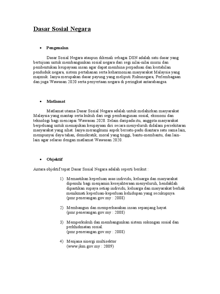 Objektif dasar sosial negara. Objektif khusus selaras dengan penyataan matlamat dan objektif umum dasar sosial negara menggariskan empat objektif khusus yang saling melengkapi dengan menerapkan nilai nilai murni di setiap peringkat pelaksananya memastikan keperluan asas individu keluarga dan masyarakat dipenuhi membangun dan memperkasakan insan sepanjang hayat. Negara objektif gubal dasar 5 kategori dasar ekonomi sosial etika kerja luar negara 6. Dasar sosial negara memberikan panduan bagi pelaksanaan dan pengurusan pembangunan sosial setanding dan seiring dengan pembangunan ekonomi untuk menghasilkan suatu kemajuan masyarakat yang mantap dan seimbang. Pengenalan dasar sosial negara dsn adalah satu dasar pembangunan sosial yang berteraskan nilai nilai murni dan peningkatan keupayaan insan bagi mencapai kesepaduan dankestabilan sosial ketahanan nasional dan kesejahteraan hidup masyarakat malaysia yang maju dan mantap.