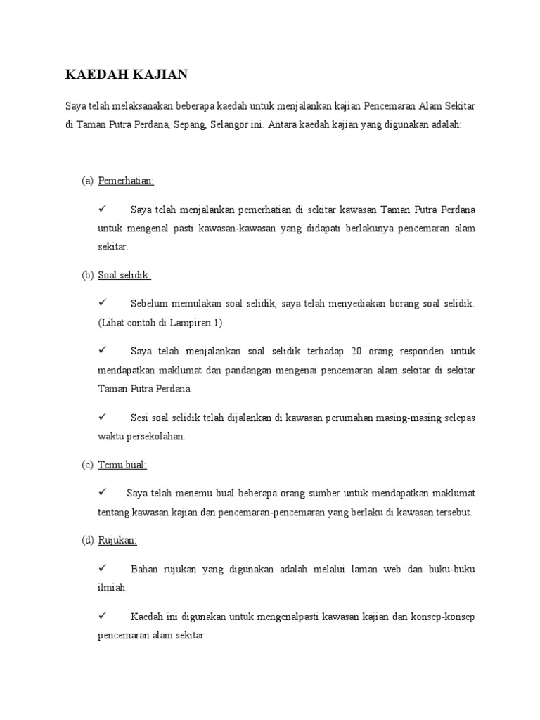 Objektif kajian pencemaran alam sekitar. Contoh kajian lengkap pencemaran alam sekitar tugasan geografi pt3 tahun 2014 hanz 1 21 am. Anda nyatakan jenis jenis pencemaran alam sekitar yang terdapat di kawasan kajian dan kemudian terangkan apakah pencemaran udara pencemaran bau pencemaran bunyi dan lain lain berserta contoh di kawasan kajian. Saya minta izin nak copy objektif kajian n kaedah kajian awak ye untuk dijadikan contoh bahan pt3 saya harap awak x kesah n halalkan semuanya thanks alot n good luck in your life. Kalau anda terangkan satu jenis sahaja pencemaran alam sekitarpun sudah cukup untuk mendapat markah penuh.