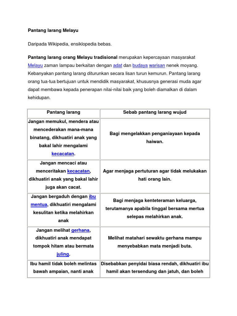 Info adat yg lengkap serta berguna. Apa yang menarik pantang larang ini tersebar luas sehinggakan banyak budaya masyarakat mengamalkannya khasnya di kawasan asia tenggara. Pantang larang semasa hamil ini dilarang keras oleh orang melayu. Pantang larang orang tua tua bertujuan untuk mendidik masyarakat khususnya generasi muda agar dapat membawa kepada penerapan nilai nilai baik yang boleh diamalkan di dalam kehidupan.