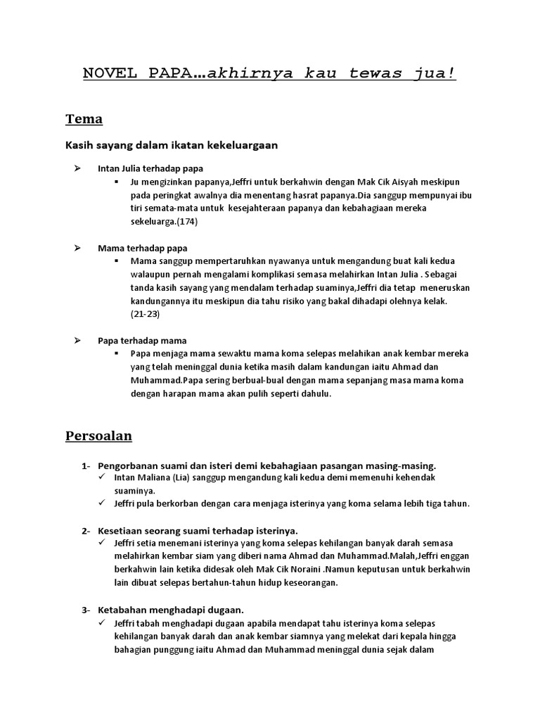 Apabila mendengar alasan papa mama mendengus keras serta melepaskan genggaman tangan papa. Sinopsis bab 6 hingga 10 tajuk 3. Sinopsis bab 16 hingga 20. Novel yang saya kaji di tingkatan 4 ialah novel papa.
