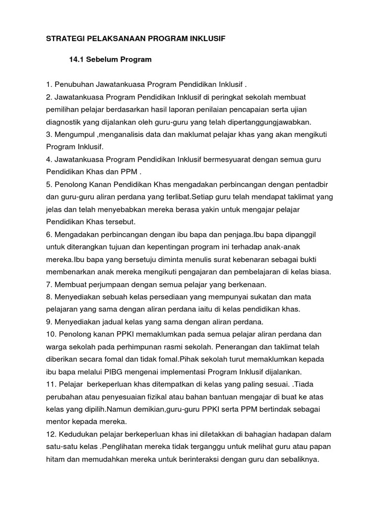 Pelaksanaan program pendidikan inklusif. Pendidikan inklusif bukan semata memasukan anak luar biasa anak berkebutuhan khusus ke sekolah umum namun justru berorientasi bagaimana layanan pendidikan ini diberikan dalam rangka memenuhi kebutuhan setiap anak dengan keunikan dan keberagaman yang secara alamiah telah mereka miliki. Jawatankuasa program pendidikan inklusif bermesyuarat dengan semua guru pendidikan khas dan ppm. Portal rasmi kementerian pendidikan malaysia. 2 ciri ciri pemilihan murid autistik ke kelas inklusif 3 program persediaan dan bantuan yang diperlukan olehmurid autistik.