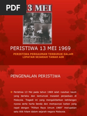 Pengenalan peristiwa 13 mei 1969. Pertumpahan darah dan kacau bilau yang dahsyat yang berlaku pada 13 mei 1969 itu hampir menghancurkan negara. Pengenalan peristiwa 13 mei 1969 merupakan satu tragedi berdarah yang banyak meninggalkan kesan terhadap politik ekonomi dan sosial masyarakat malaysia. Peristiwa 13 mei 1969 merupakan satu rusuhan antara kaum yang tercetus 41 tahun yang lalu. Peristiwa 13 mei 1969 merupakan satu rusuhan antara kaum yang tercetus 41 tahun yang lalu.