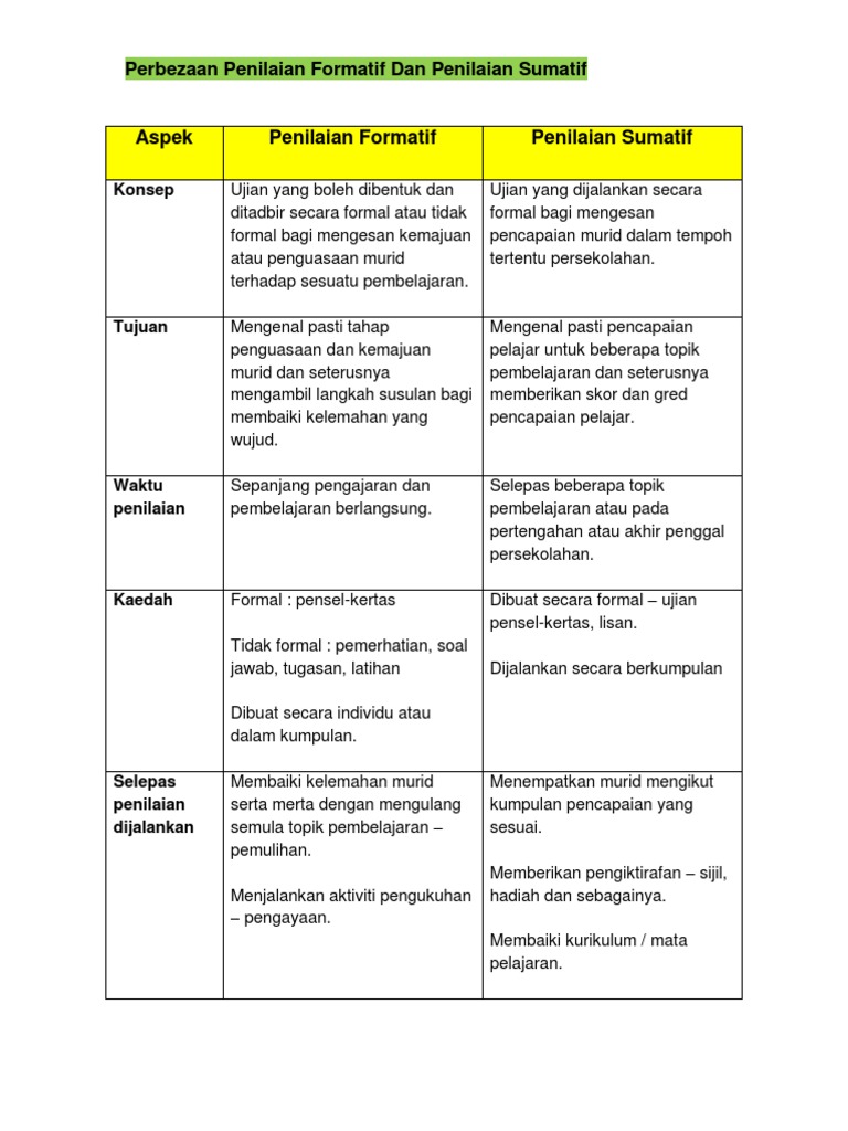Pengetahuan dan keterampilan praktis dalam melaksanakan penilaian formatif. Penilaian formatif dan penilaian sumatif mempunyai beberapa ciri ciri perbezaan dari segi pengertian tujuan aktiviti masa bentuk sasaran liputan rekod dan tindakan. Perbezaan antara penilaian formatif dan penilaian sumatif 1. Pentaksiran untuk pembelajaran merupakan sebahagian daripada proses pdp.