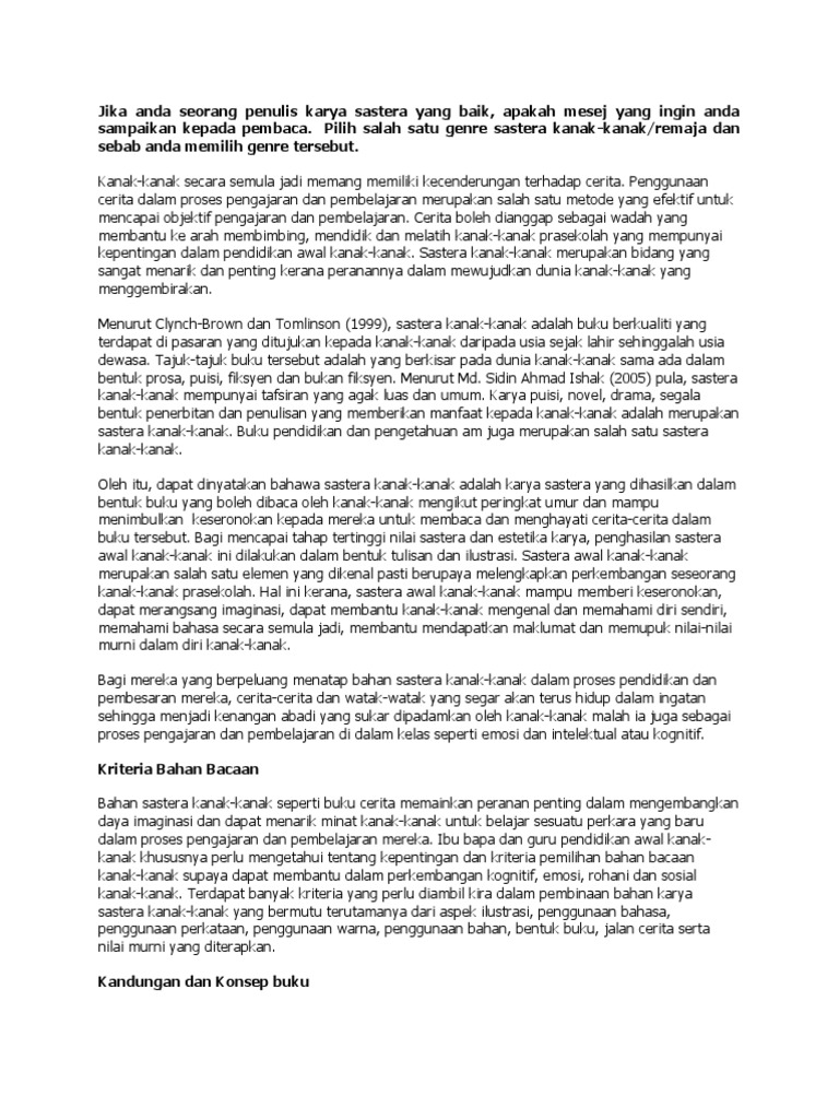 Namun persoalannya sekarang pada usia dewasa ini ketika saya diminta untuk menghasilkan karya sastera untuk kanak kanak mahupun remaja saya sudah mula berasa agak sukar untuk melakukannya lagi kerana bagi saya menulis 500 patah perkataan bagi sesebuah cerita kanak kanak adalah seumpama kita menulis 50 000 patah perkataan iaitu samalah jika kita menulis sebuah novel bagi orang dewasa. Bmm1024 karya sastera kanak kanak remaja dewasa dan popular disediakan oleh antasha binti kamaruzzaman 2. Paling penting lagi menulis karya sastera kanak kanak adalah satu tanggungjawab yang harus dipikul oleh penulis demi membentuk kecintaan kanak kanak terhadap ilmu bahasa dan sastera negara. Seharusnya penulis karya sastera kanak kanak tidak berasa rendah diri untuk berkarya sebaliknya berbangga kerana bukan mudah untuk menulis karya kanak kanak yang baik.