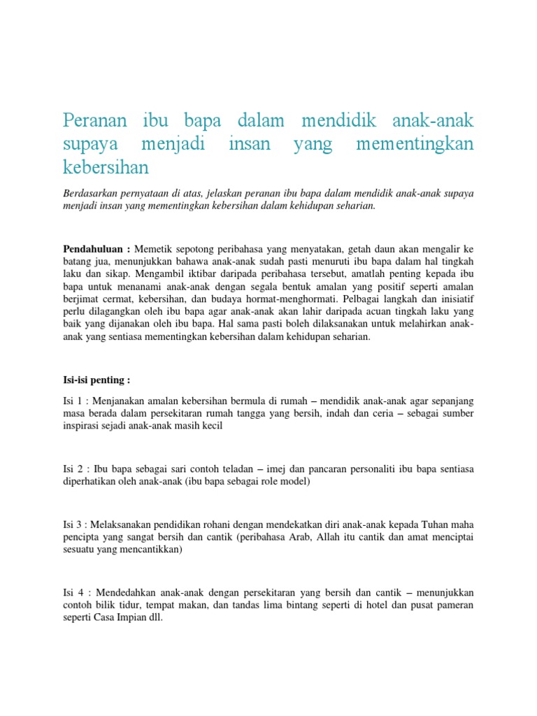 Peranan ibu bapa terhadap anak anak karangan spm. Sememangnya peranan ibu bapa dalam membentuk sahsiah anak anak adalah untuk menyediakan sumber rohani yang kukuh kepada anak anak mereka sekaligus menjauhkan mereka daripada gejala sosial. Pada masa yang sama ibu bapa juga memainkan peranan yang amat penting untuk memberi ilmu pengetahuan kepada anak anak mereka dalam usaha membentuk sahsiah bahkan juga menghindari mereka daripada gejala sosial. Pada masa yang sama ibu bapa juga memainkan peranan yang amat penting untuk memberi ilmu pengetahuan kepada anak anak mereka dalam usaha membentuk sahsiah bahkan juga menghindari mereka daripada gejala sosial. Oleh itu keluarga terutamanya ibu bapa memainkan peranan yang penting untuk membentuk keperibadian anak anak.