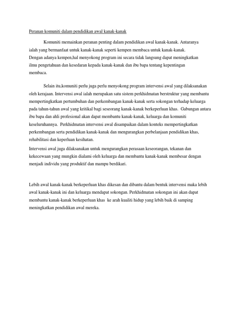 Peranan komuniti dalam pendidikan awal kanak kanak. Perkembangan program pendidikan awal kanak kanak wednesday may 2 2012. Mengiring dan mengawasi murid dalam program lawatan dan aktiviti akiviti luar kelas yang lain. Penglibatan ibu bapa dalam aktiviti pembelajaran kanak kanak sangat mempengaruhi. Unit ini berperanan bagi menyediakan program dan latihan dalam pendidikan khas untuk guru guru sekolah rendah dan sekolah menengah.
