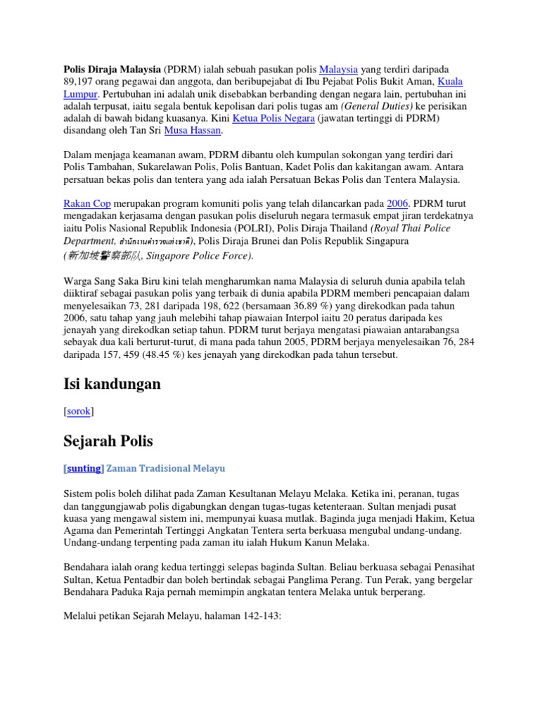 Peranan polis tugas anggota polis adalah menjaga ketenteraman awam pada setiap masa. Its headquarters are located at bukit aman kuala lumpur the police force is led by an inspector general of police igp who as of 4 may 2019 is abdul hamid bador. Keanggotaan ini mencerminkan kepelbagaian penugasan yang dijalankan oleh pdrm dari tugas am yang menjalankan tugas tradisional kepolisan dan sentiasa berdampingan dengan rakyat sehinggalah ke pasukan gerakan am yang menjalankan tugas tugas non regulatory seperti pencegahan kemasukan. Polis diraja malaysia pada 16 september 1963 pasukan polis di tanah melayu sabah sarawak dan singapura telah disatukan dan dikenali dengan nama polis diraja malaysia dengan diterajui oleh seorang ketua polis negara.