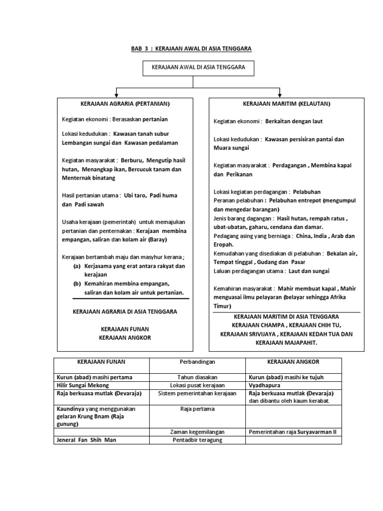 Tamadun awal asia tenggara nota sejarah tingkatan 4 bab 3 tamadun awal asia tenggara nota sejarah tingkatan 4 bab 3 1. Bandingkan ciri ciri kerajaan agraria maritim 1. Perkembangannya berkait rapat dengan keluaran hasil pertanian kerana mempunyai teknologi pertanian. Kerajaan agraria bergantung kepada kerajaan maratim untuk mendapatkan barangan mewah dari negara luar seperti china dan india.