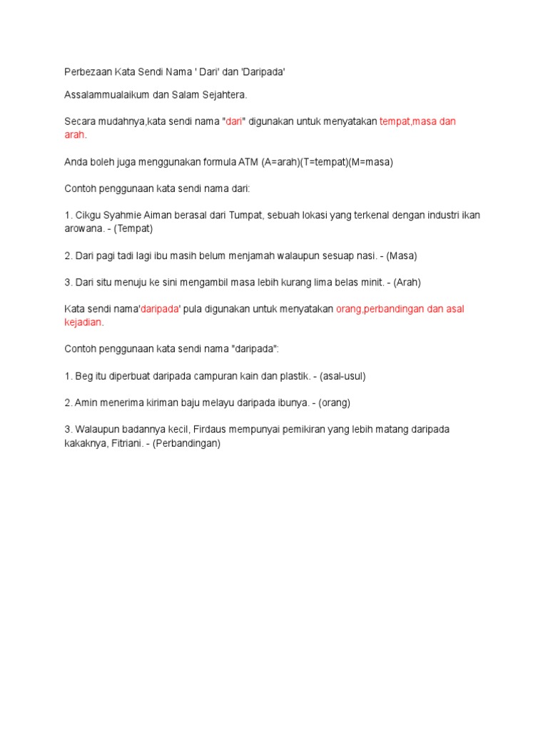 Kata dari perlu digugurkan di sini. Itulah dua perbedaan cara penempatan kata dari dan daripada dalam sebuah kalimat. Sehubungan dengan itu penggunaan kata sendi nama dalam frasa dari pengalaman didapati tidak tepat kerana perkataan pengalaman tidak merujuk arah tempat atau masa atm. Ada perbedaan mencolok antara sensus dan pengambilan sampel meskipun keduanya bertujuan untuk menyediakan data dan informasi tentang suatu populasi.