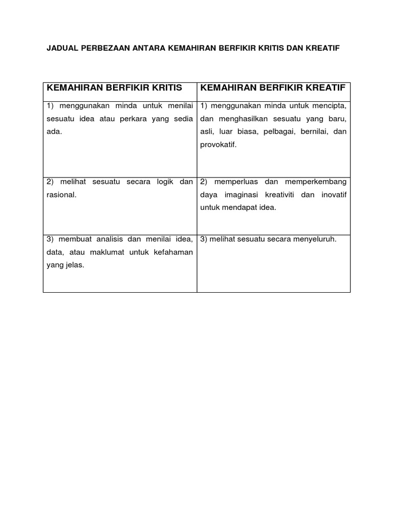 Hamid dan diterbitkan pada tahun 2010 pada harga rm 50 00. Ini adalah salah satu perbezaan utama antara pemikiran kreatif dan pemikiran kritis. Apa perbedaan berpikir kritis dan berpikir kreatif. Kemahiran berfikir secara kritis kemahiran berfikir secara kreatif membanding dan membezakan menjana dan menghasilkan idea mengkategorikan membuat hipotesis menghuraikan mengsintesis merumuskan dan meramal menghubungkaitkan perbezaan antara pemikiran kritis dan pemikiranf kreatif next 18.