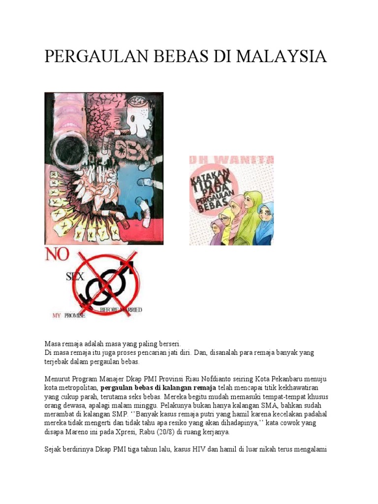 Pergaulan bebas di malaysia. 6 pergaulan bebas pengenalan sejak akhir akhir ini kes yang melibatkan masalah tingkah laku seksual remaja di malaysia semakin membimbangkan. Pergaulan bebas merupakan pergulan yang tidak sesuai dengan nilai dan norma yang berlaku dalam masyarakat. Kesempatan dalam satu pertemuan bersama beberapa aktivis sosial yang anti establishment membincangkan isu negatif seperti perilaku anak anak muda dalam kancah penyalahgunaan dadah merempit buang bayi dan pergaulan bebas namun ada diantara mereka yang mempersoalkan penglibatan ahli intelek sebagai pengkaji sosial yang berteraskan rujukan teori semata mata. Hal itu biasanya terjadi di kalangan remaja yang bisa dicirikan oleh beberapa hal diantaranya yaitu.
