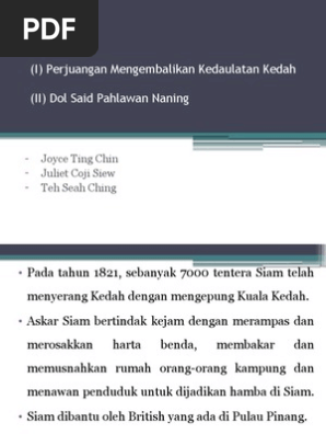 Peristiwa penentangan dol said scribd. Tidak bersetuju dengan british meletakkan naning sebagai sebahagian daripada wilayah. Peperangan naning yang berlaku pada tahn 1834 telah menjadikan dol said seorang wira. Dol said merupakan pemerintah naning yang kesembilan membantah pengenaan cukai ke atas daerahnya oleh pihak british. Dipimpin oleh penghulu dol said.