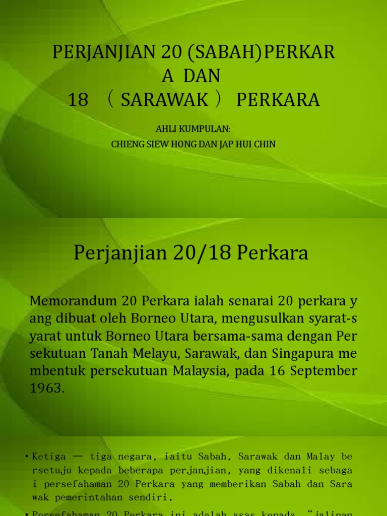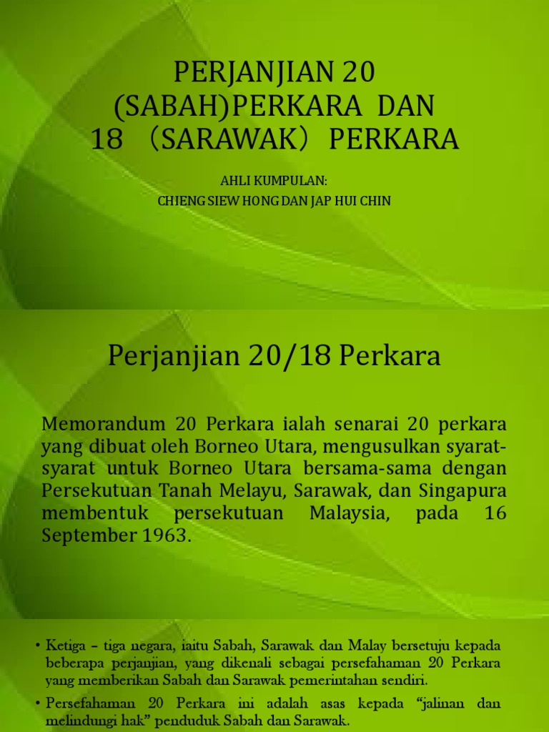 J pada 20 jun 2012 kredit. Sejarah kemerdekaan dan perjanjian sabah dan sarawak membentuk malaysia perkara 20. Menurut teo lagi sungguhpun kedua dua perjanjian 20 perkara sabah dan 18 perkara sarawak tersebut tidak rasmi terdapat elemen daripada kedua dua perjanjian yang telah diserap masuk ke dalam perlembagaan malaysia. Ia kemudiannya dikenali perjanjian 20 perkara untuk sabah dan perjanjian 18 perkara untuk sarawak.