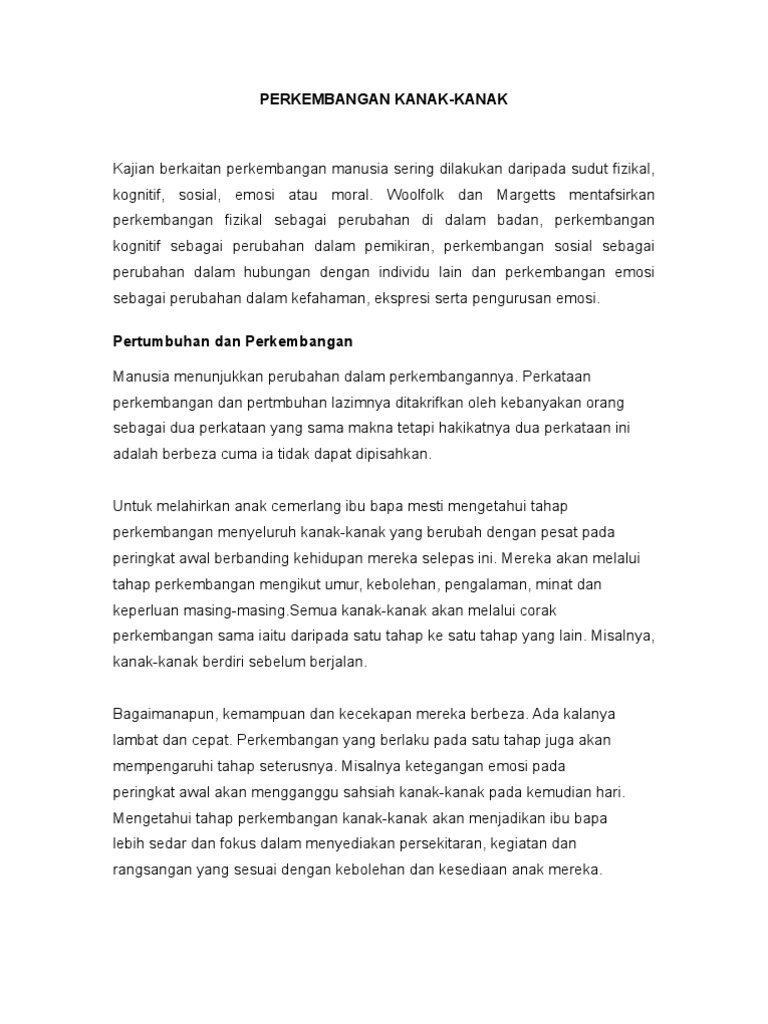 Tidak suka untuk dipakaikan baju. Proses pertumbuhan ini berbeza mengikut umur dan tisu tisu badan yang terlibat contohnya bilangan neuron sel otak dibentuk semasa pertengahan kehamilan manakala bilangan gentian fiber otot terbentuk sejurus kelahiran 1 3 perkembangan kanak kanak dari aspek fizikalperkembangan fizikal merupakan satu aspek yang menekankan asas pertumbuhan danpembesaran kanak kanak dalam keadaan sihat. Peringkat kemahiran pengurusan diri yang perlu dikuasai kanak kanak mengikut perkembangan umur mereka. Kanak kanak pintar cerdas memiliki perkembangan yang berbeza berbanding dengan kanak kanak normal dari segi kognitif dan fizikal.