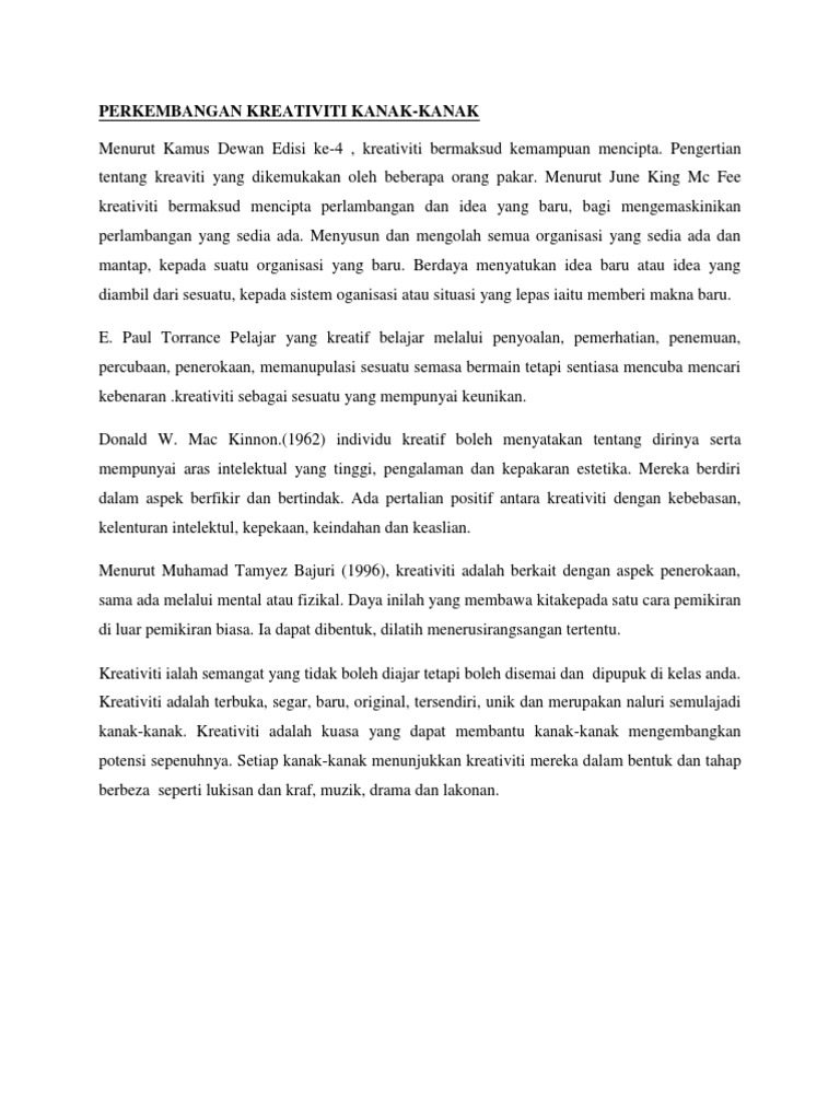 Pada peringkat awal kanak kanak sentiasa melintasi sempadan sempadan norma ketika asyik bermain atau apabila tekun melakukan sesuatu aktiviti. Dalam konteks perkembangan kreativiti piaget dan vygotsky bersetuju berkenaan kebaikan bermain dalam mengembangkan kreativiti kanak kanak. Akibat sifat kompleks konsep kreativiti berbagai teori telah dikembangkan bagi tujuan menjelaskannya. Bidang pembelajaran perkembangan kreativiti dan estetika bagi kanak kanak 0 6 tahun bermatlamat mengembangkan keupayaan untuk.