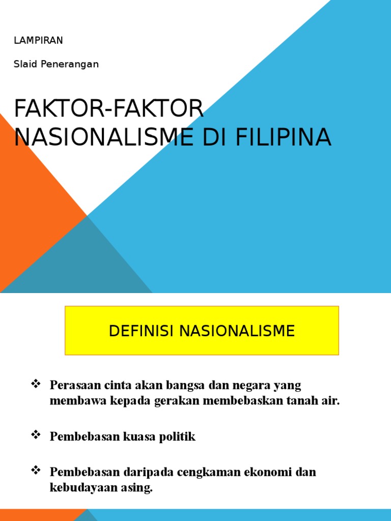 Faktor faktor pemangkin nasionalisme di tanah melayu sehingga perang dunia. Lahirnya nasionalisme di indonesia selain disebabkan penderitaan panjang di bidang ekonomi sosial pendidikan hukum dan politik juga dipengaruhi oleh meningkatnya semangat bangsa bangsa terjajah lainnya dalam meraih kemerdekaan antara lain dari filipina dan india. Menuntut supaya filipina dijadikan wilayah sepanyol dan bangsa filipina. Sepanyol memperkenalkan sistem pentadbiran berpusat.
