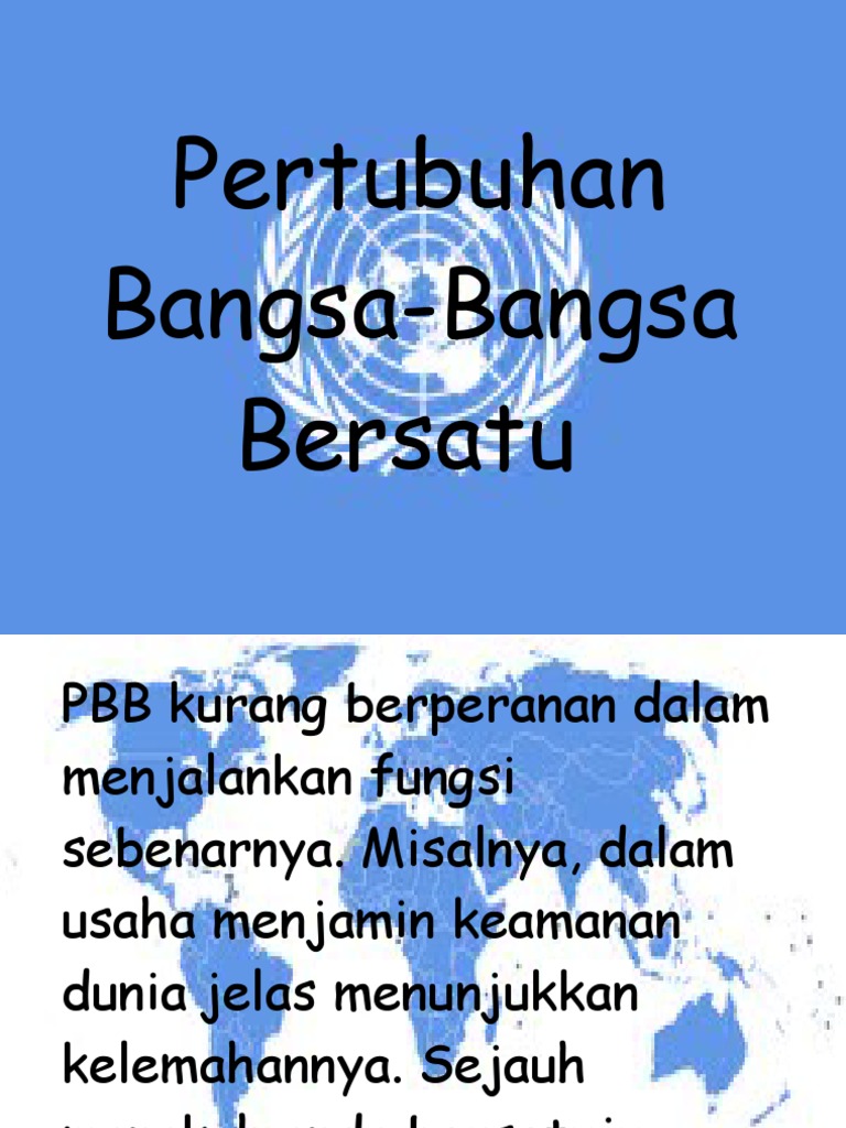 Pbb juga memainkan peranan menyelesaikan konflik antarabangsa secara aman tanpa penggunaan kekerasan. Pertubuhan bangsa bangsa bersatu pbb 1. Negara terakhir yang menyertai pbb ialah timur leste pada 27 september 2002. Atas kesedaran para pemimpin dunia diwujudkan suatu pakatan antarabangsa yang dinamakan liga bangsa.
