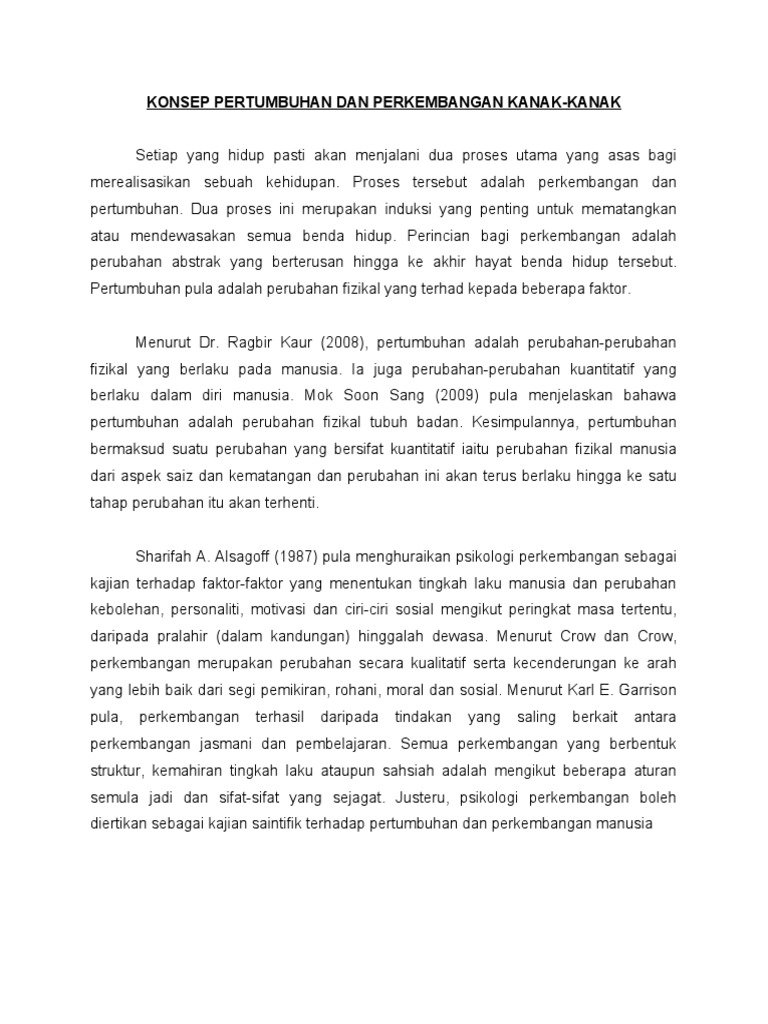 Pertumbuhan dan perkembangan kanak kanak. Ini bermakna kanak kanak tidak dapat melakukan sesuatu perlakuan sehinggalah mereka mencapai sesuatu pada peringkat umur tertentu. Pertumbuhan dan perkembangan kanak kanak hingga awal remaja prinsip prinsip pertumbuhan dan perkembangan pertumbuhan membawa maksud sebarang perubahan yang boleh dinilai atau diukur secara kuantiti dan boleh diukur daripada suatu peringkat perkembangan yang tertentu ke peringkat perkembangan yang lain yang lebih nilainya daripada yang asal. Dalam konteks perbincangan ini penulis akan membincangkan tentang konsep pertumbuhan dan perkembangan kanak kanak. Pengetahuan mengenai psikologi pertumbuhan dan perkembangan membolehkan guru memahami perkembangan konsep yang dicapai oleh kanak kanak berbagai umur akan membolehkan guru merancang serta memilih.