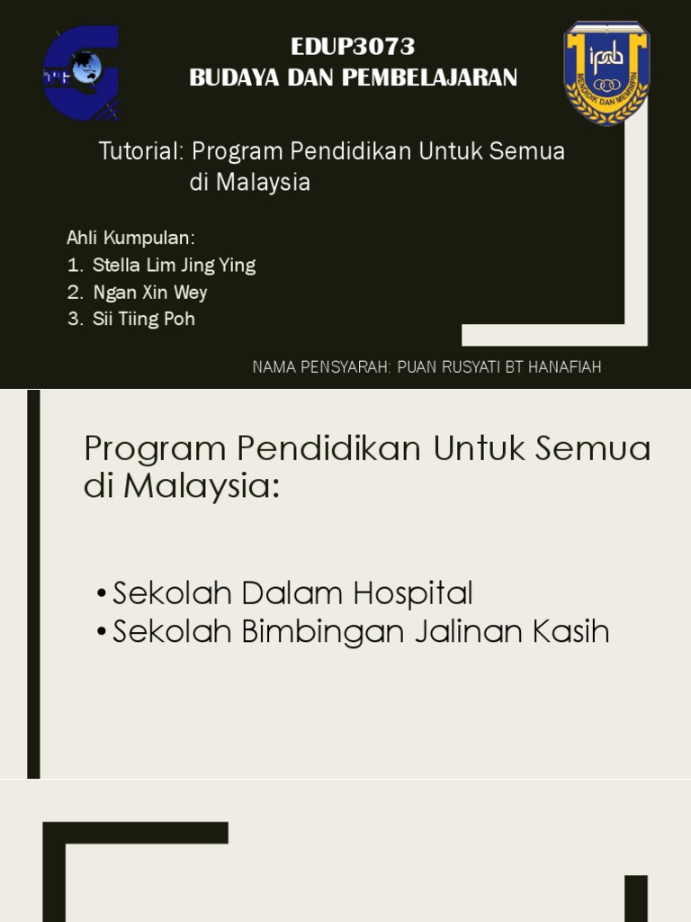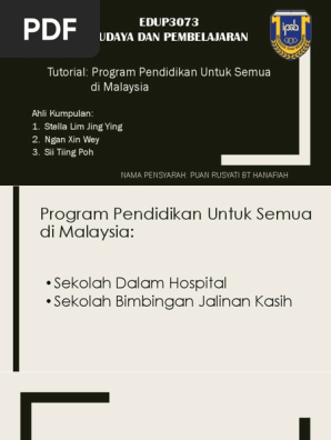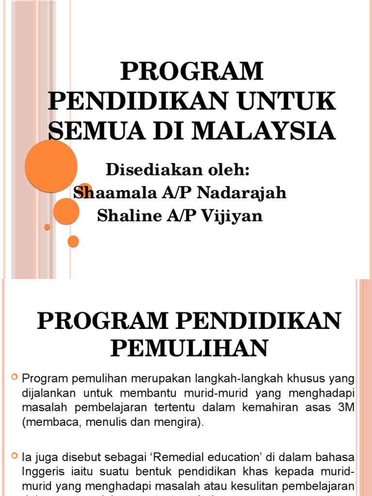 Sekolah dalam hospital sekolah bimbingan jalinan kasih sekolah dalam hospital pengenalan satu konsep baru dalam sistem pendidikan di malaysia menyediakan pendidikan bagi semua kanak kanak serta remaja yang menjalani rawatan di hospital idea penubuhan sekolah dalam hospital ini telah dicetuskan oleh. Pendidikan untuk semua 2 pendahuluan 2 wawasan 2020 2 falsafah pendidikan kebangsaan 4. Hasil daripada kajian yang telah dijalankan didapati program pendidikan pemulihan amat perlu bagi membantu kanak kanak yang menghadapi masalah pembelajaran. Shaamala a p nadarajah shaline a p vijiyan program pendidikan pemulihan program pemulihan merupakan langkah langkah khusus yang dijalankan untuk membantu murid murid yang menghadapi masalah pembelajaran tertentu dalam kemahiran asas 3m membaca menulis dan mengira.