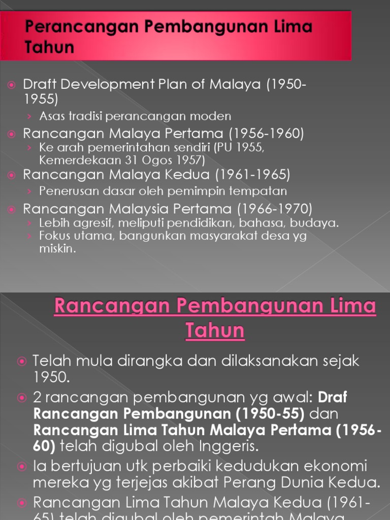 Rancangan lima tahun bermula dengan rancangan malaya pertama 1956 1960. Rancangan malaysia merupakan rancangan lima tahun pembangunan kerajaan malaysia rancangan lima tahun ini merupakan kesan peninggalan daripada zaman pemerintah british di tanah melayu selepas perang dunia kedua rancangan lima tahun bermula dengan rancangan malaya pertama iaitu dari tahun 1956 hingga 1960. Rancangan malaysia kedua 1971 1975 dasar ekonomi baru deb rancangan malaysia ketiga 1976 1980 rancangan malaysia keempat 1981 1985 rancangan. Mempelbagaikan sumber negara dan mengurangkan kebergantungan kepada sektor tertentu khususnya timah dan getah.