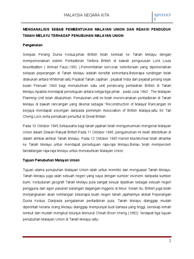 Tanah melayu jadi tanah jajahan british bukan lagi naungan british. 2 3 reaksi penduduk tempatan terhadap malayan union kebanyakan orang melayu menentang malayan union atas fakor. A menyeru orang melayu mengadakan perhimpunan besar besaran b membuat laporan kepada wakil british c mendapatkan lebih banyak sokongan rakyat d wadah untuk menyatukan orang melayu 7 adakah golongan wanita juga turut terlibat dalam bantahan terhadap malayan union. 2 5 penubuhan persekutuan tanah melayu 1948.