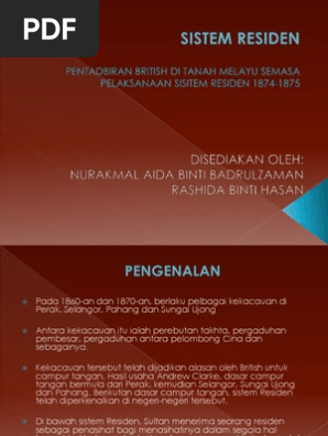 1 mengikut sistem residen residen ialah seoang pegawai british yang dilantik untuk menasihati sultan dan nasihatnya itu mesti dipatuhi dalam semua perkara kecuali berkaitan dengan agama islam dan adat istiadat melayu. Sistem residen merupakan satu bentuk sistem pemerintahan secara tidak langsung di negeri negeri melayu di pantai barat tanah melayu. Pada awalnya sistem residen telah diperkenalkan oleh british di perak pada tahun 1874 berikutan termeterainya perjanjian pangkor. 1 mengikut sistem residen residen ialah seoang pegawai british yang dilantik untuk menasihati sultan dan nasihatnya itu mesti dipatuhi dalam semua perkara kecuali berkaitan dengan agama islam dan adat istiadat melayu.