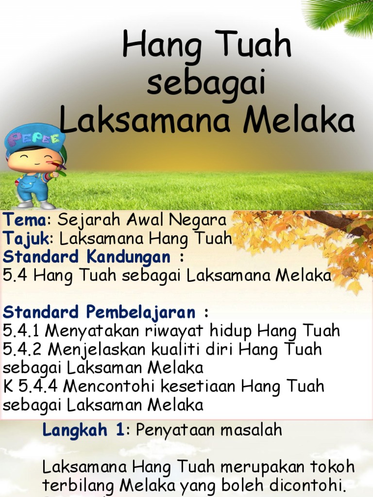 Hikayat hang tuah ialah sebuah epik kepahlawanan yang merentasi sepanjang zaman naik turun kerajaan empayar melaka hang tuah merupakan seorang laksamana yang terutama serta pahlawan melayu yang taat kepada rajanya terutama semasa pemerintahan sultan mansur shah di melaka pada abad ke 15 hikayat ini dipercayai mula ditulis sekitar 1700 manuskrip leiden cod or 1762 tetapi manuskrip lengkap. Hang tuah ialah seorang pahlawan legenda berbangsa melayu pada masa pemerintahan kesultanan melaka di abad ke 15 kesultanan melayu melaka bermula pada 1400 1511. Setelah itu hang tuah hidup bersembunyi hingga lewat tahun masihi 1641. Menurut rekod sejarah laksamana hang tuah dilahirkan di kampung sungai duyong melaka iaitu pada tahun 1444.