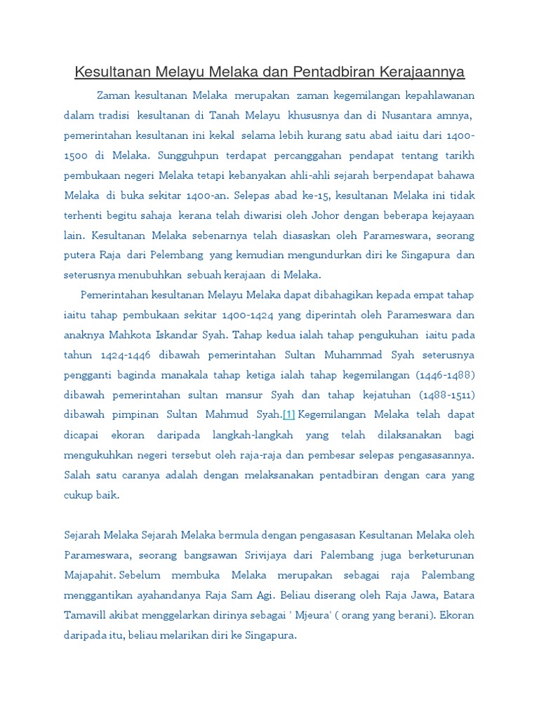 Sistem pemerintahan kesultanan melayu melaka diketuai oleh. Pemerintahan kesultanan melayu melaka berterusan selama lebih satu abad setelah melaka tewas di tangan penjajah portugis pimpinan alfonso de albuquerque pada 1511. Kenyataan tome pires yang mengatakan they have civil and criminal jurisdiction over every person in their lands membuktikan adanya undang undang yang dilaksanakan sepanjang abad ke 15. Daripada zaman kesultanan melayu melaka banyak pengajaran yang dapat diambil dan diamalkan dalam memajukan pentadbiran negara pada masa kini hal ini penting bagi mengelakkan kita daripada melakukan kesilapan kesilapan yang pernah dilakukan oleh pemimpin pemimpin terdahulu sehingga meruntuhkan empayar yang sangat berpontensi untuk menjadi satu kuasa besar suatu masa dahulu oleh hal yang. Sistem ekonomi zaman kesultanan melaka abad ke 15.