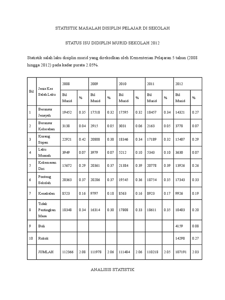 Dianalisis dengan menggunakan statistik deskriptif. Ia bukan sahaja melibatkan pihak sekolah kementerian pelajaran malah turut melibatkan pihak polis dalam mengambil tindakan terhadap murid murid yang terbabit kerana masalah ini bukan sekadar. Masalah disiplin di kalangan pelajar merupakan isu yang hangat diperkatakan oleh pelbagai pihak dan didapati semakin meruncing. Walau bagaimanapun masalah disiplin di kalangan pelajar sekolah menegah lebih serius berbanding dengan pelajar di sekolah rendah.