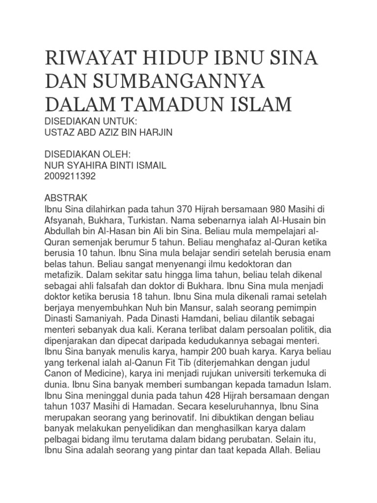 Karya canon of medicine ini telah menjadi rujukan universiti terkemuka di dunia. Nur syahira binti ismail 2009211392 abstrak ibnu sina dilahirkan pada tahun 370 hijrah bersamaan 980 masihi di afsyanah bukhara turkistan.